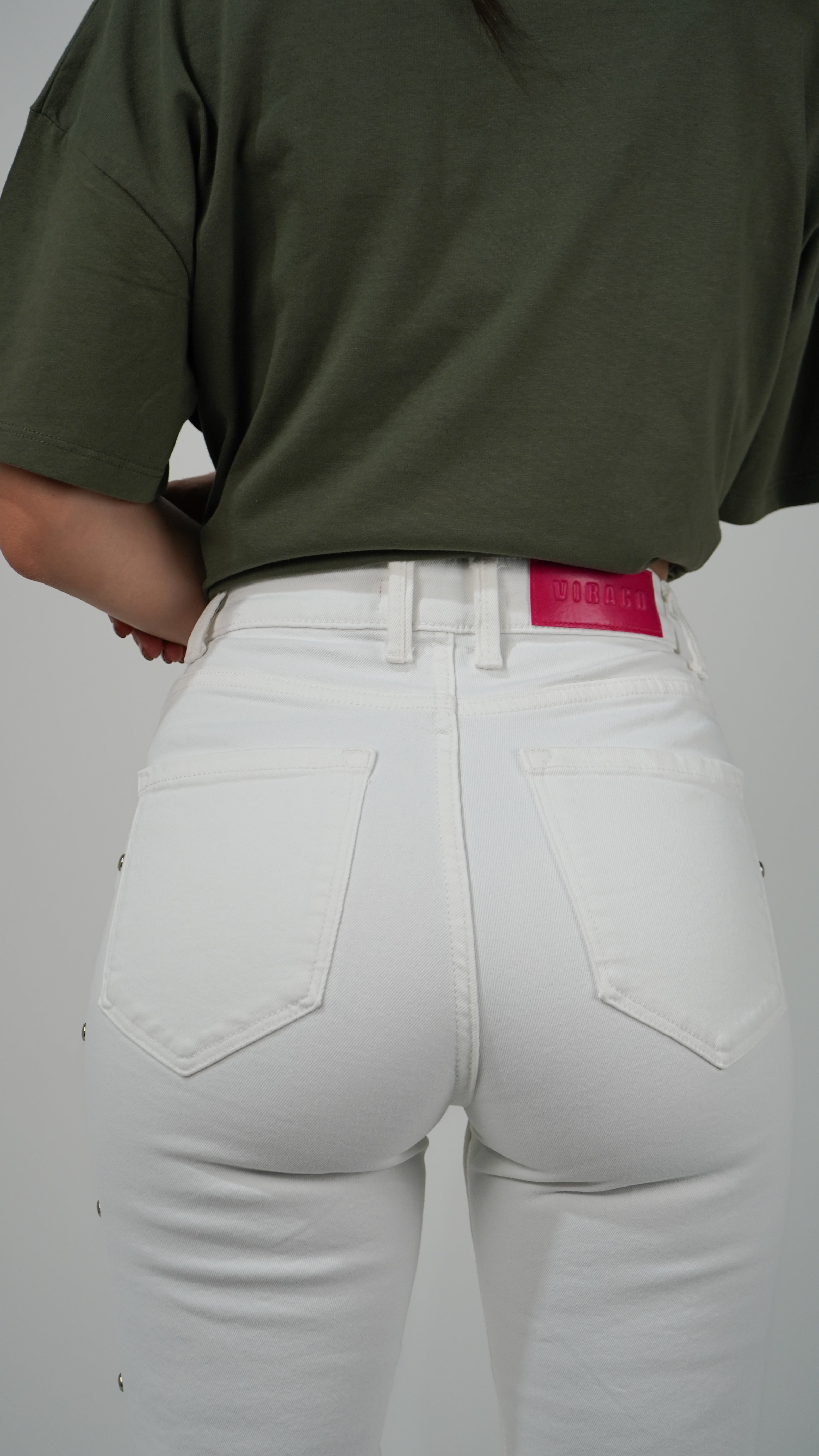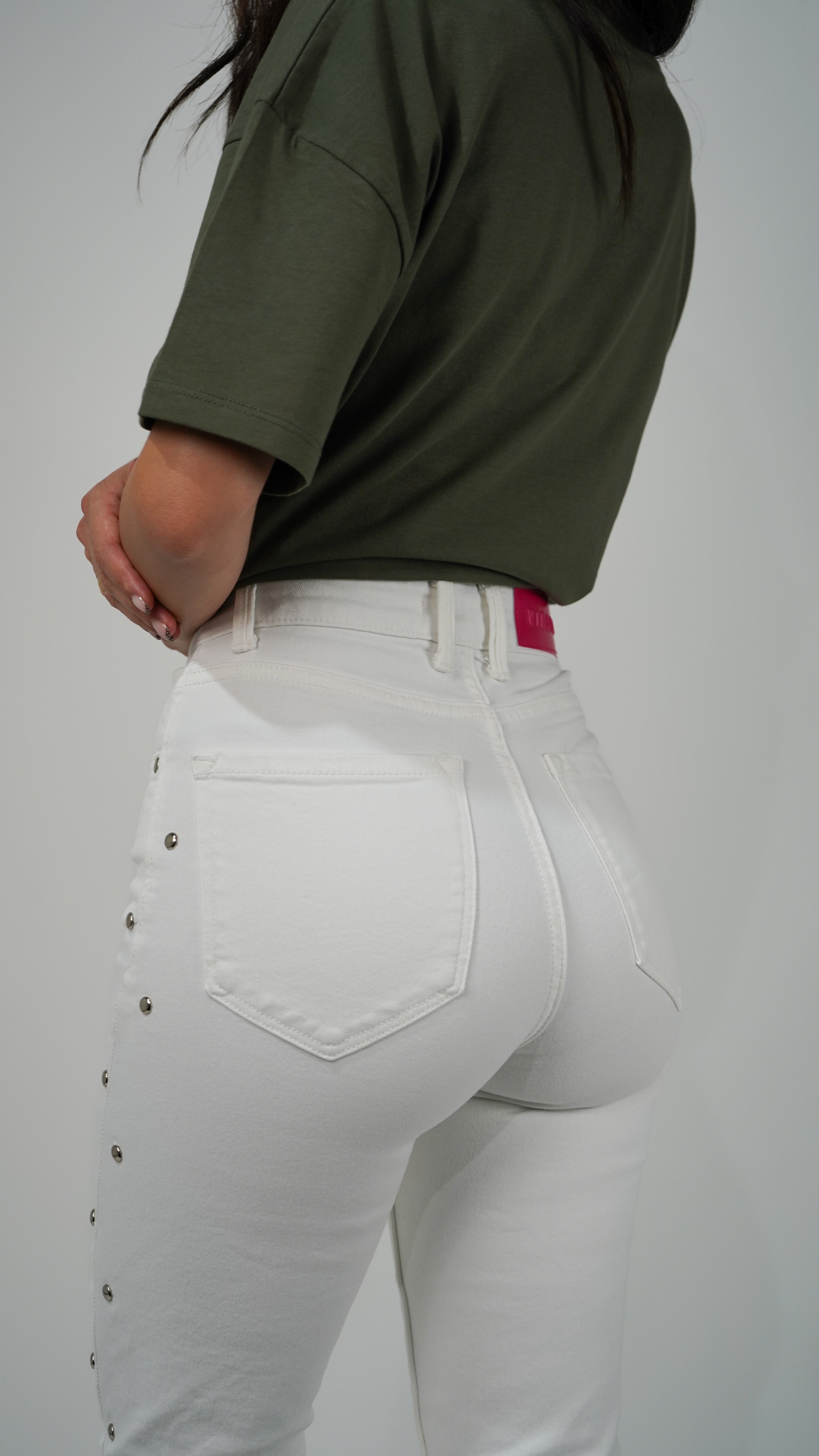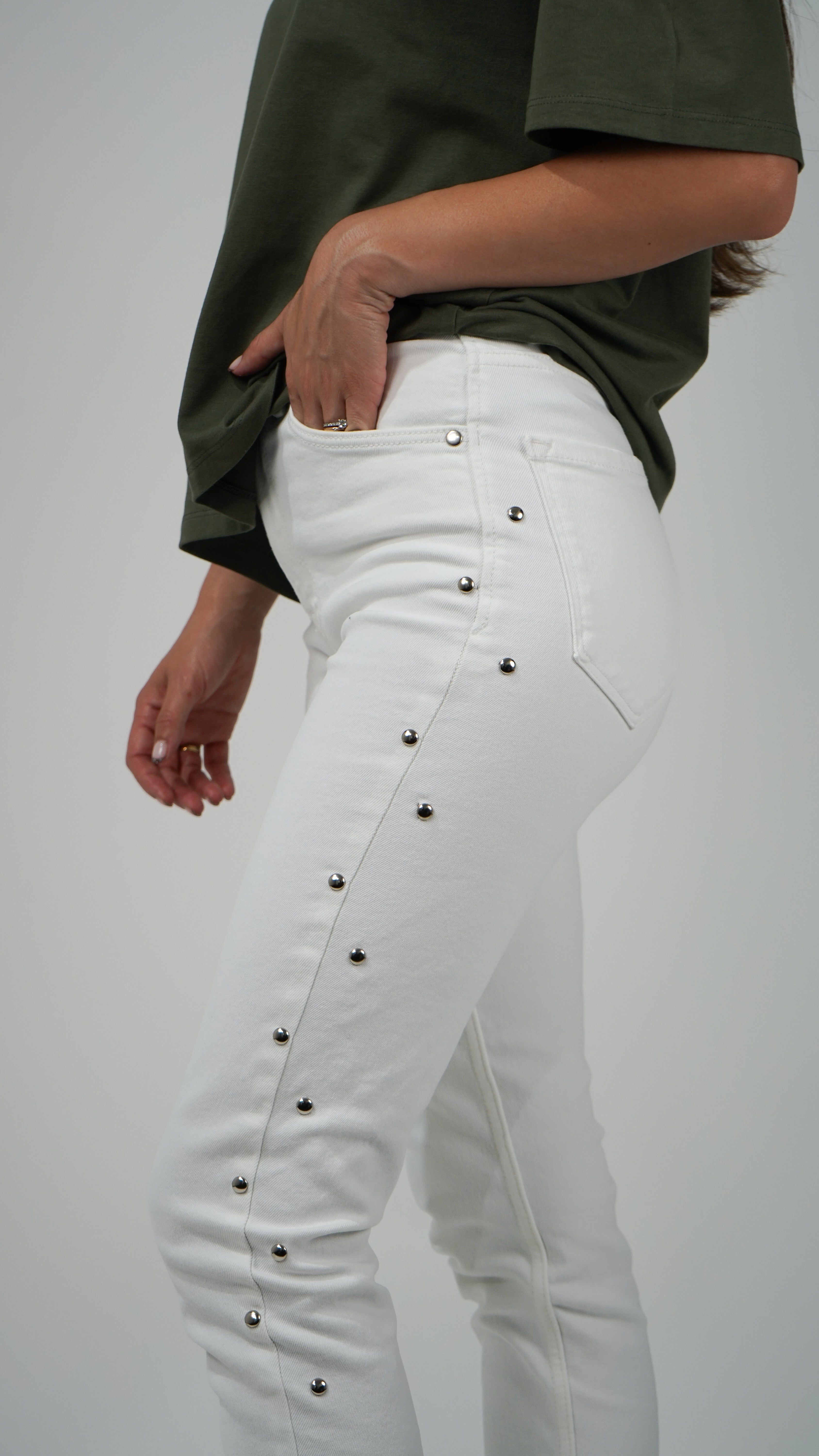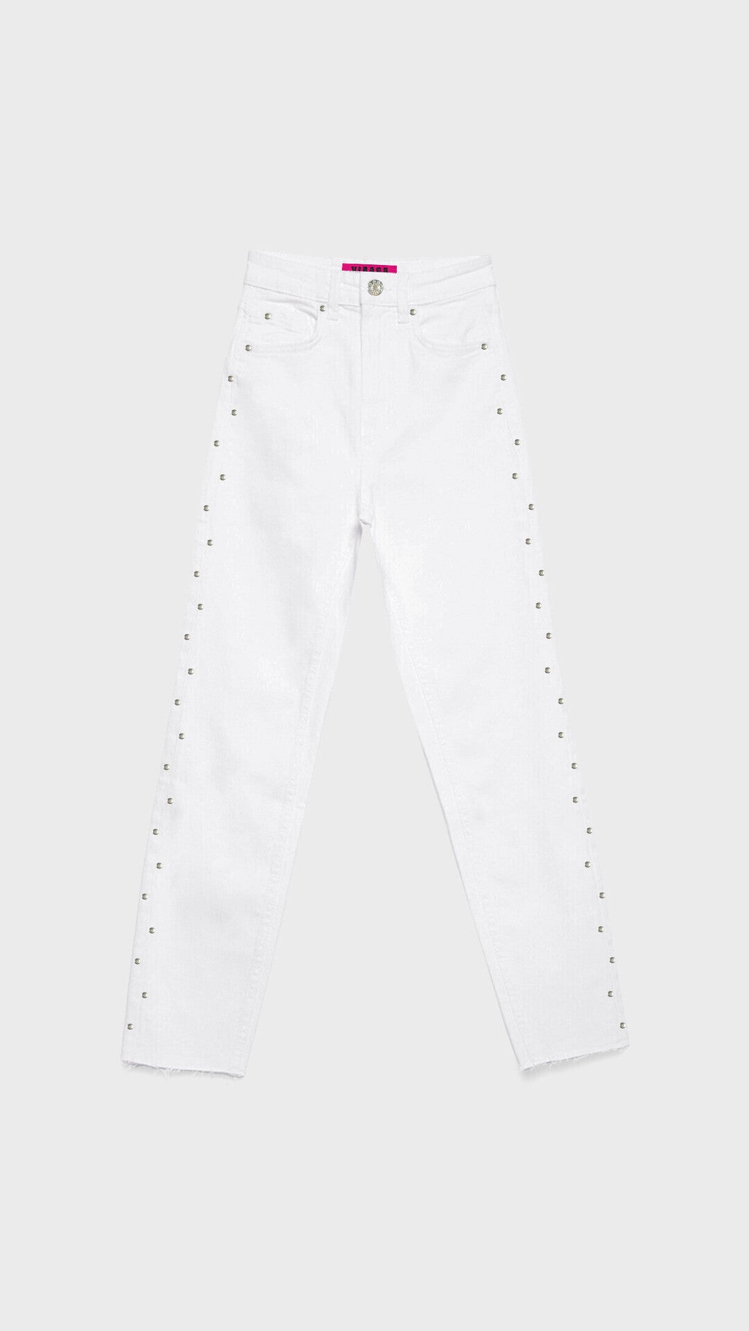 Con un patrón en zig-zag de tachas plateadas que recorre los laterales, aportando un carácter único y cañero a los vaqueros.