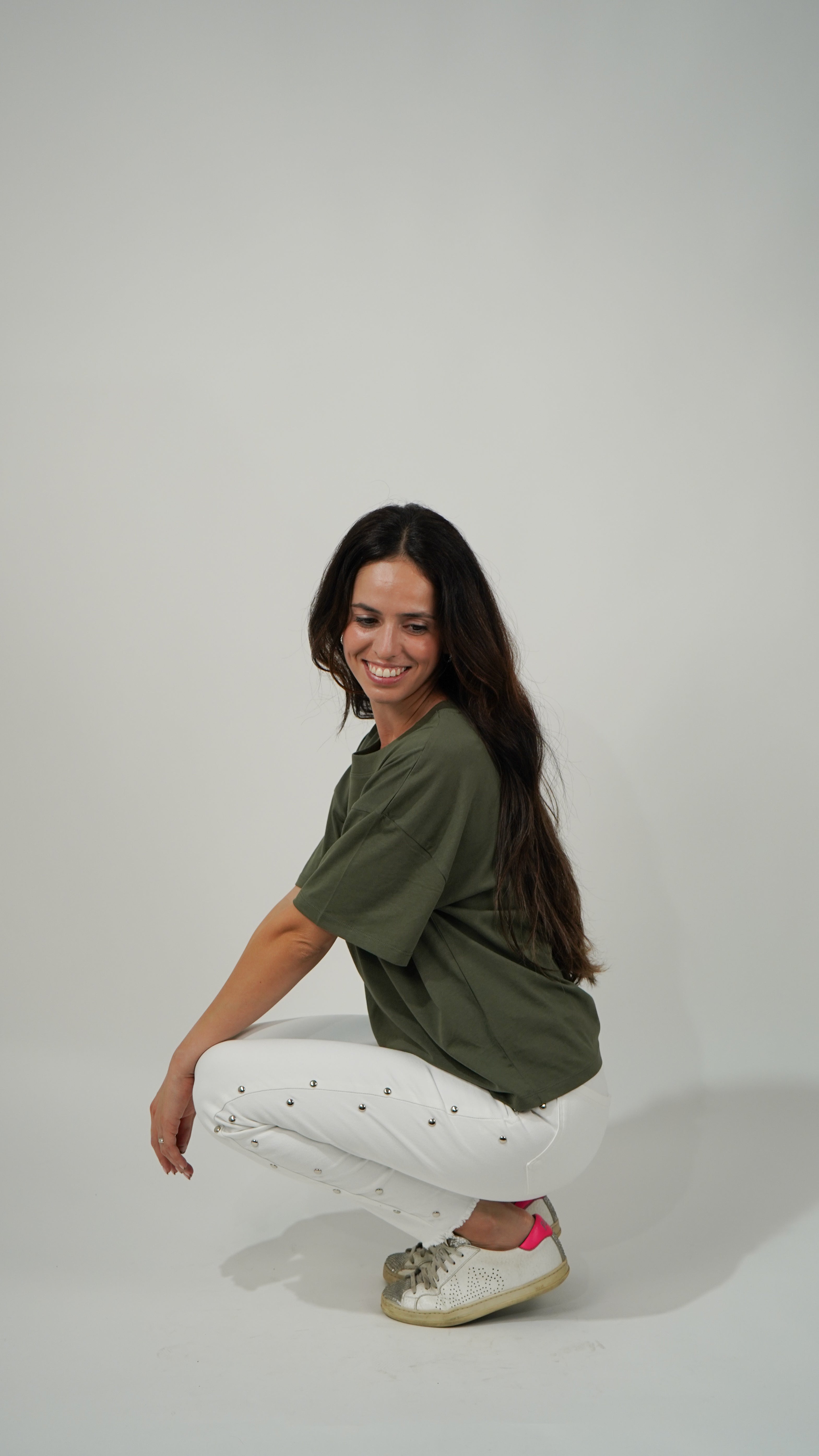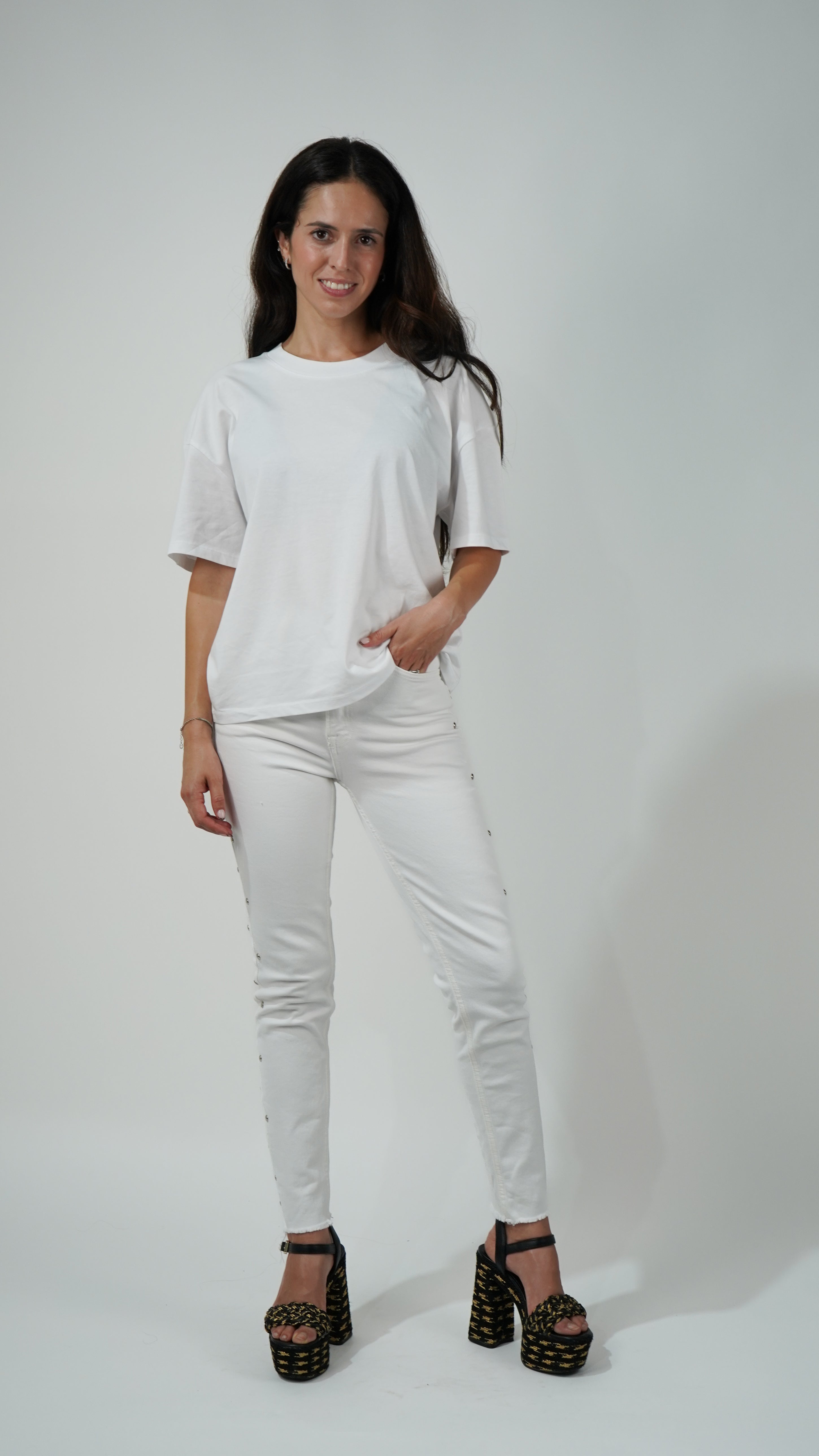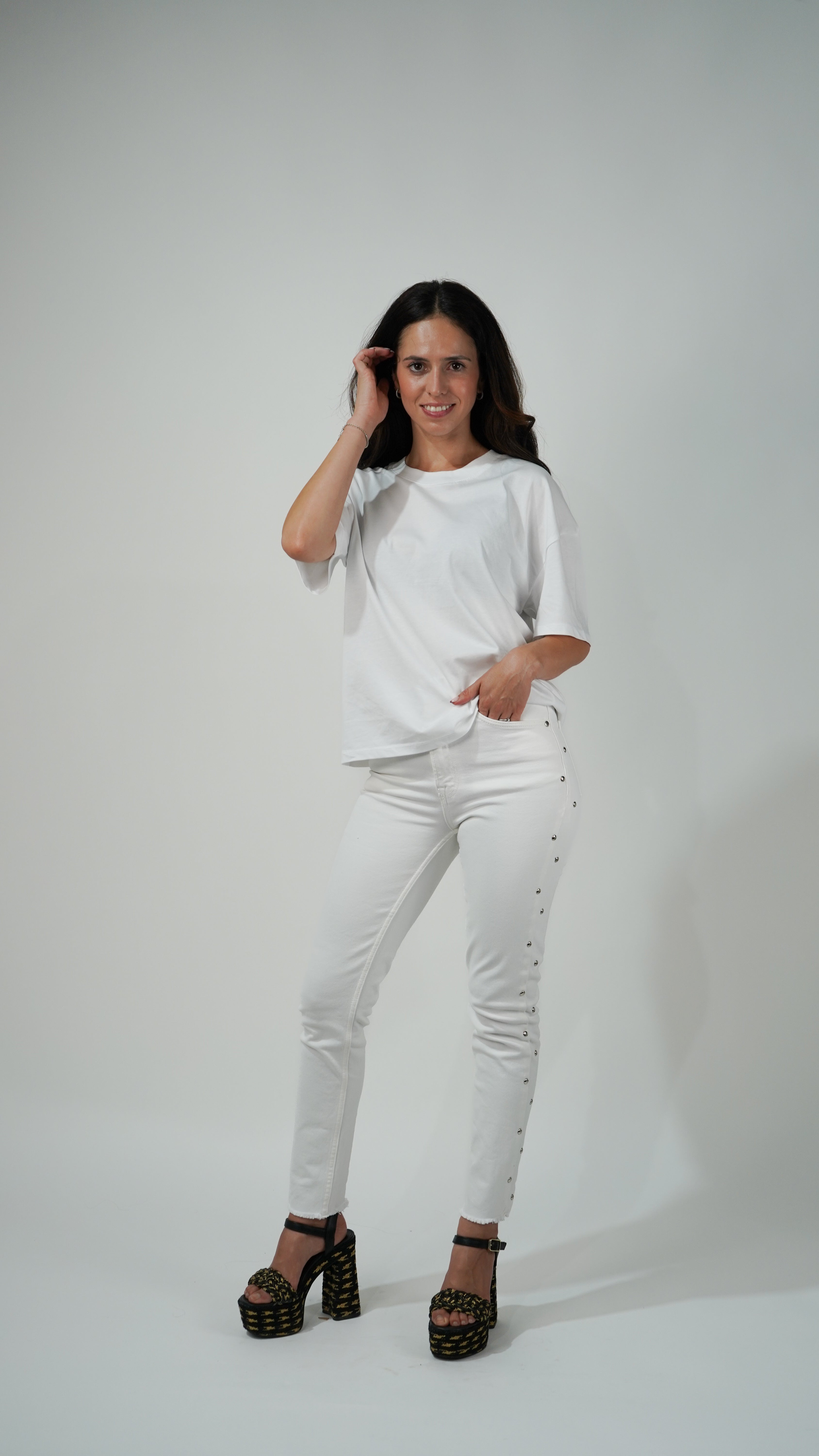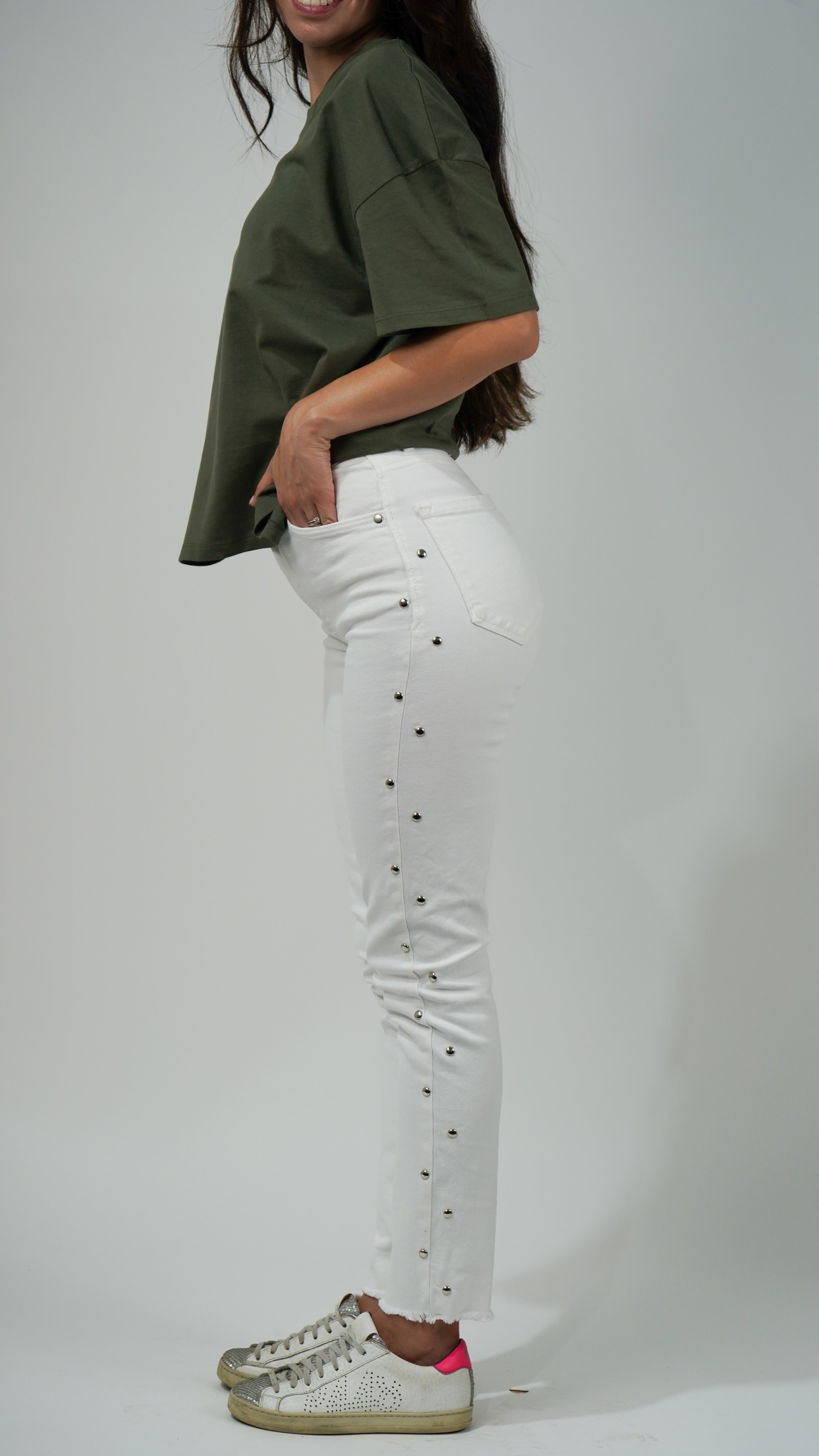 Con un patrón en zig-zag de tachas plateadas que recorre los laterales, aportando un carácter único y cañero a los vaqueros.