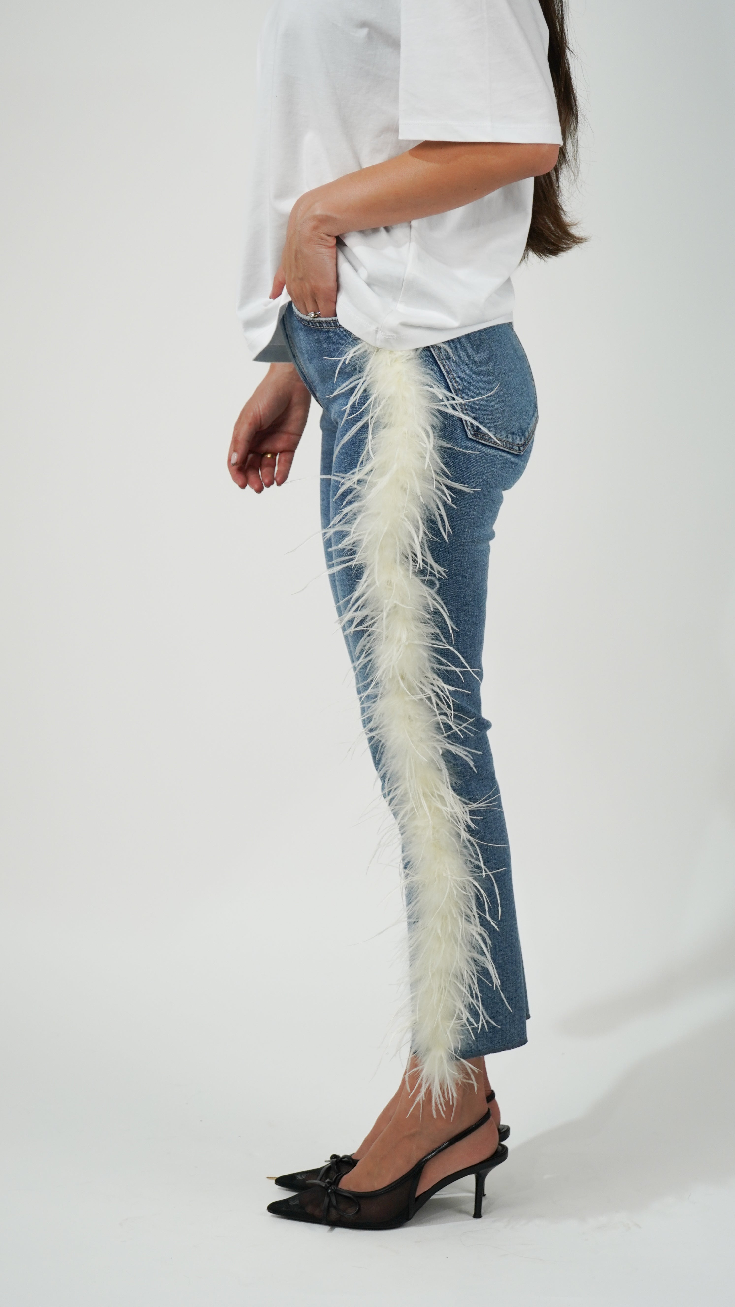 El pantalón presenta un detalle único: una boa de plumas que recorre el lateral izquierdo desde justo debajo del bolsillo delantero hasta el bajo.