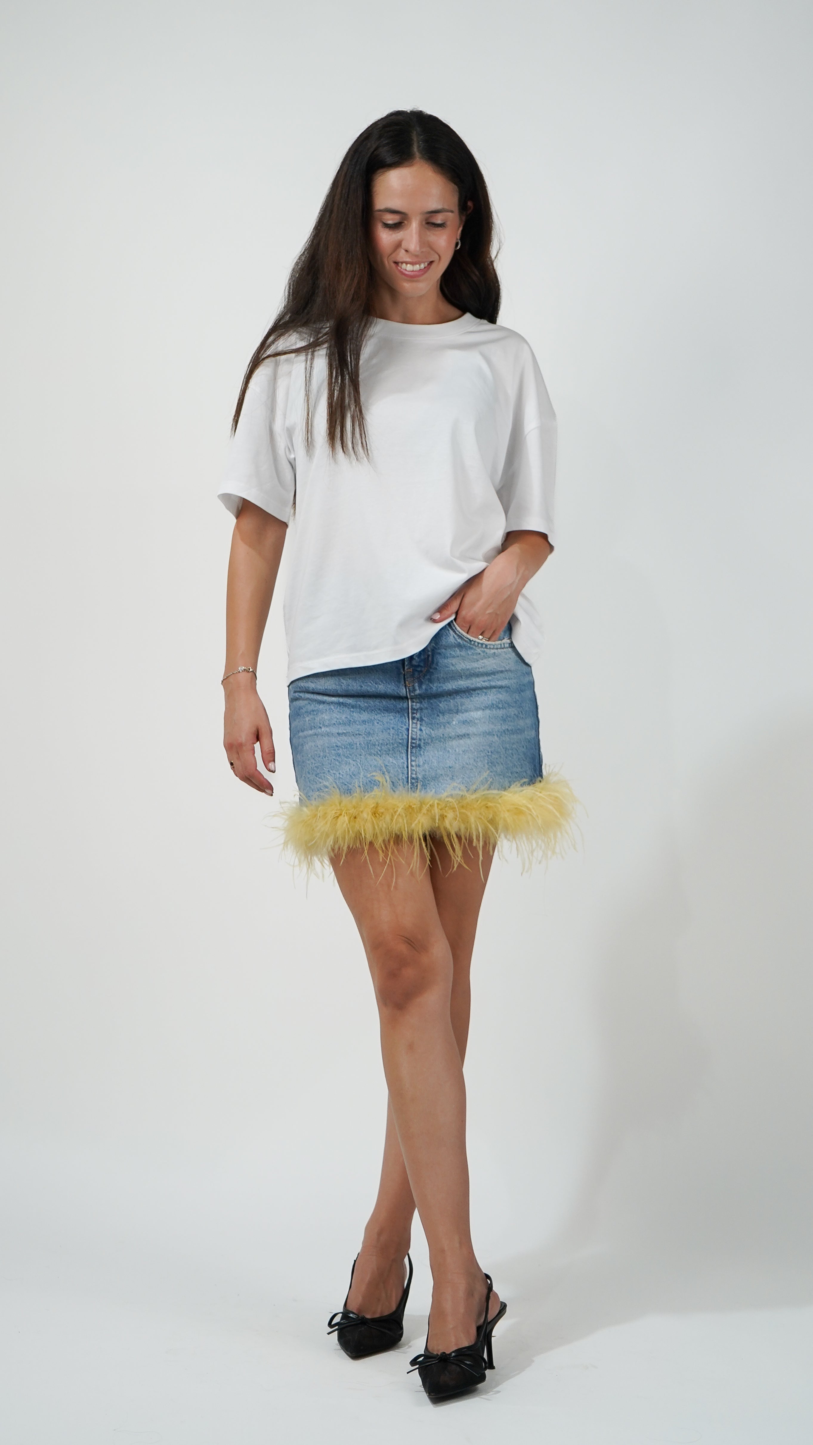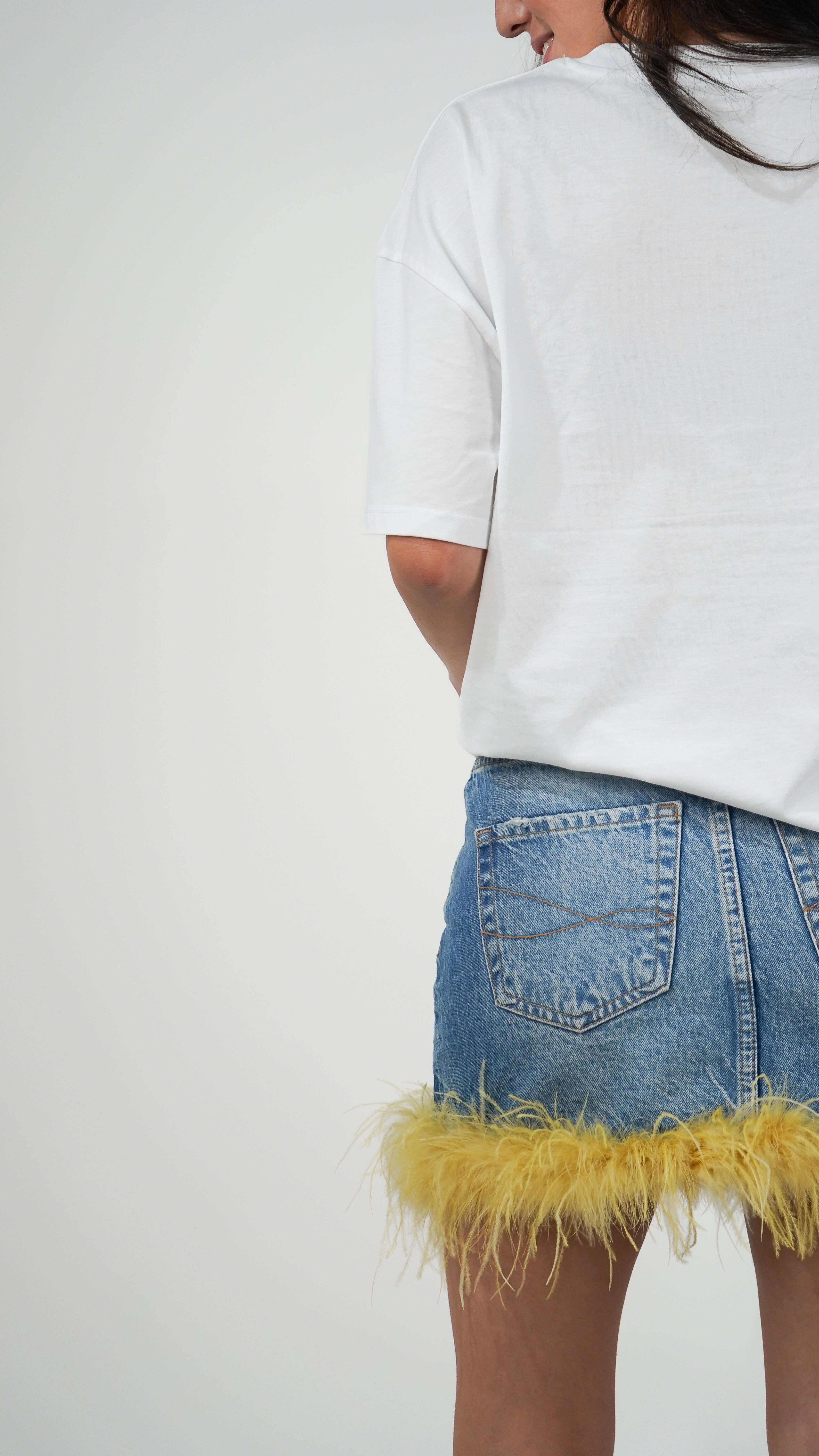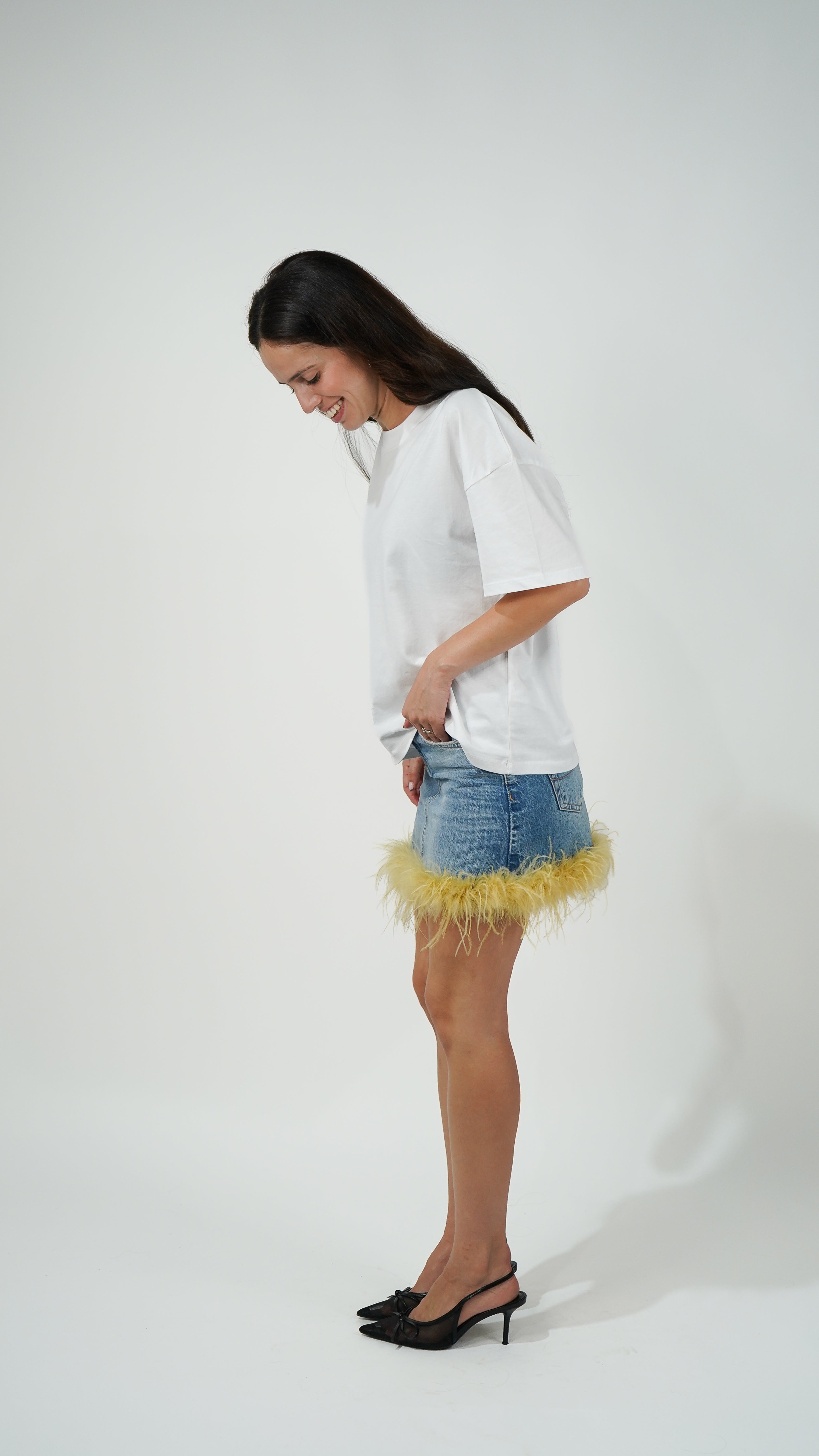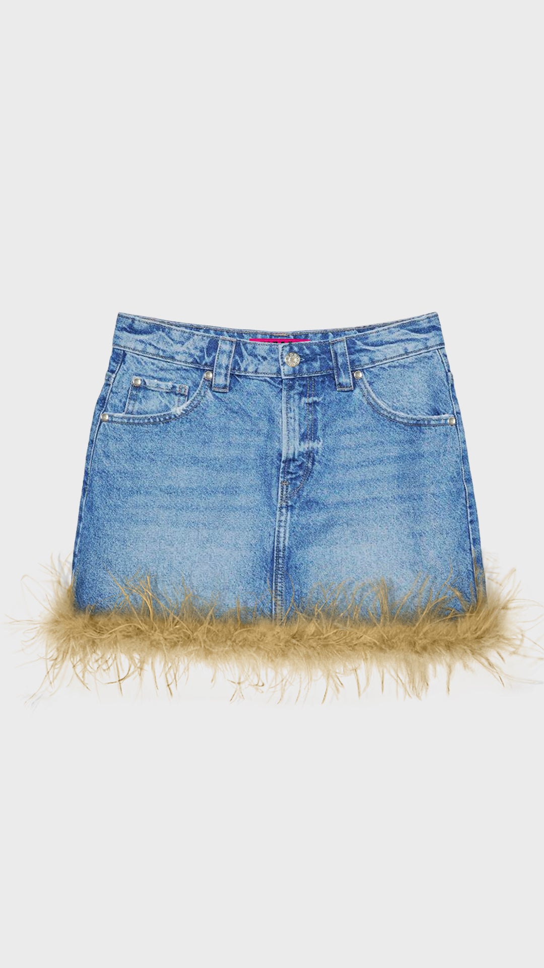 El detalle estrella: una boa de plumas que adorna todo el bajo, aportando un toque femenino, atrevido y lleno de personalidad.