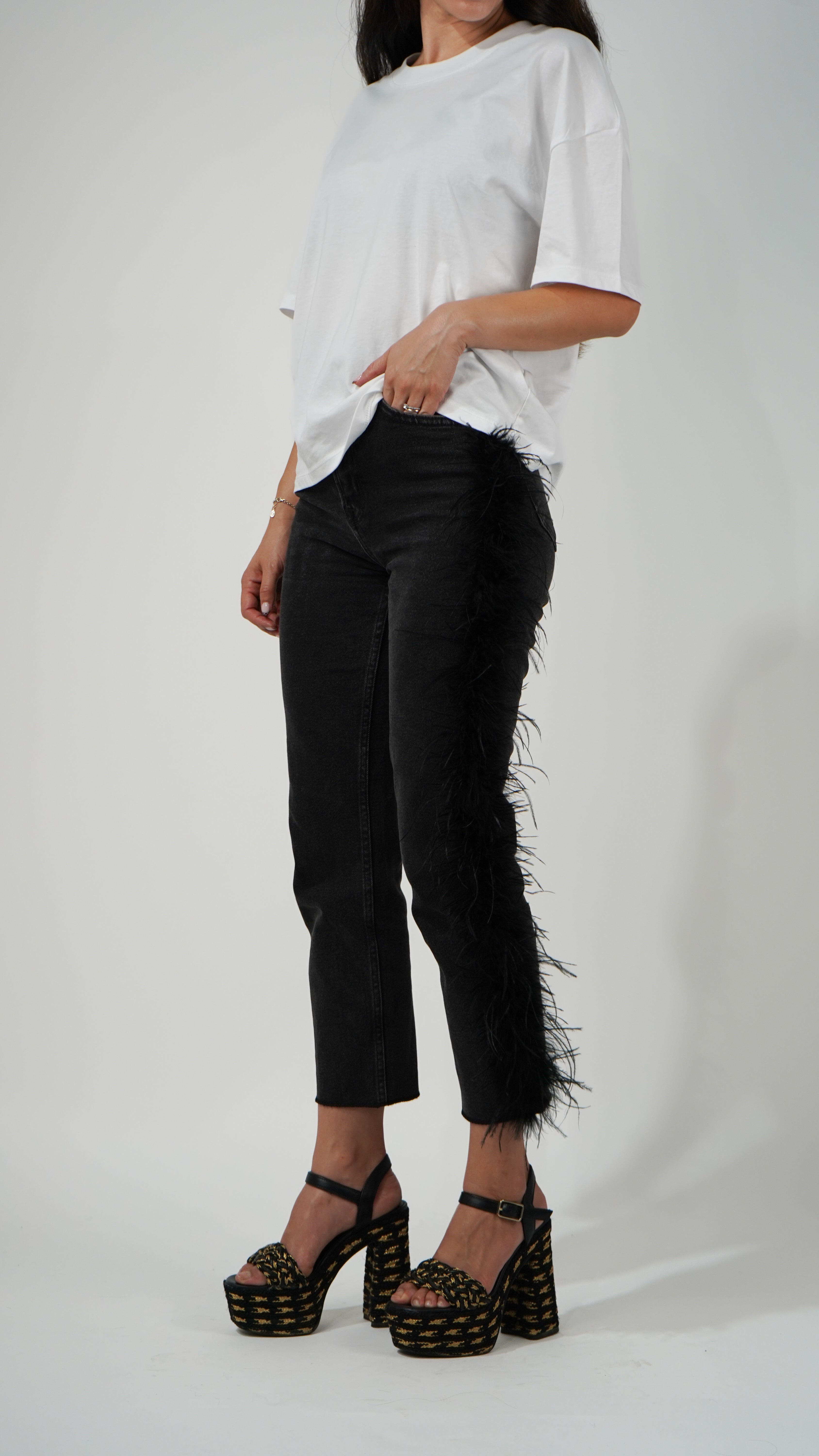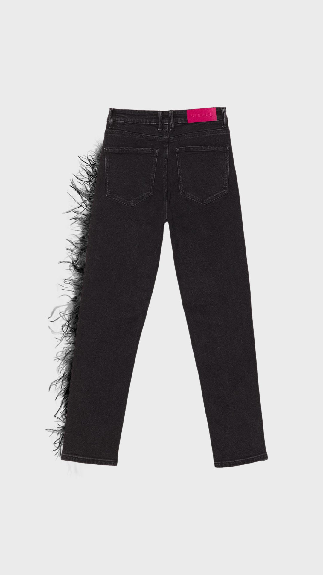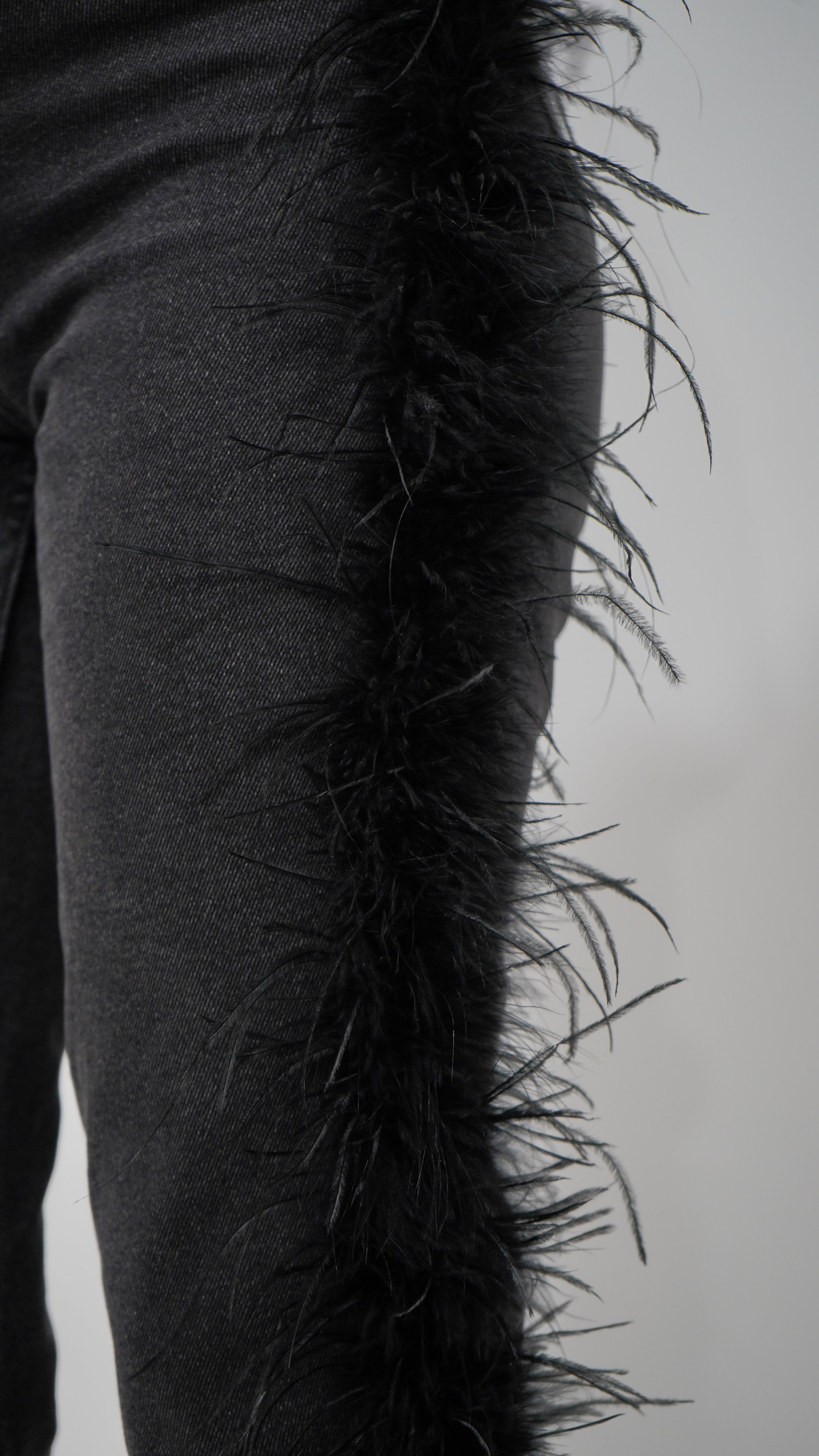 El pantalón presenta un detalle único: una boa de plumas que recorre el lateral izquierdo desde justo debajo del bolsillo delantero hasta el bajo.