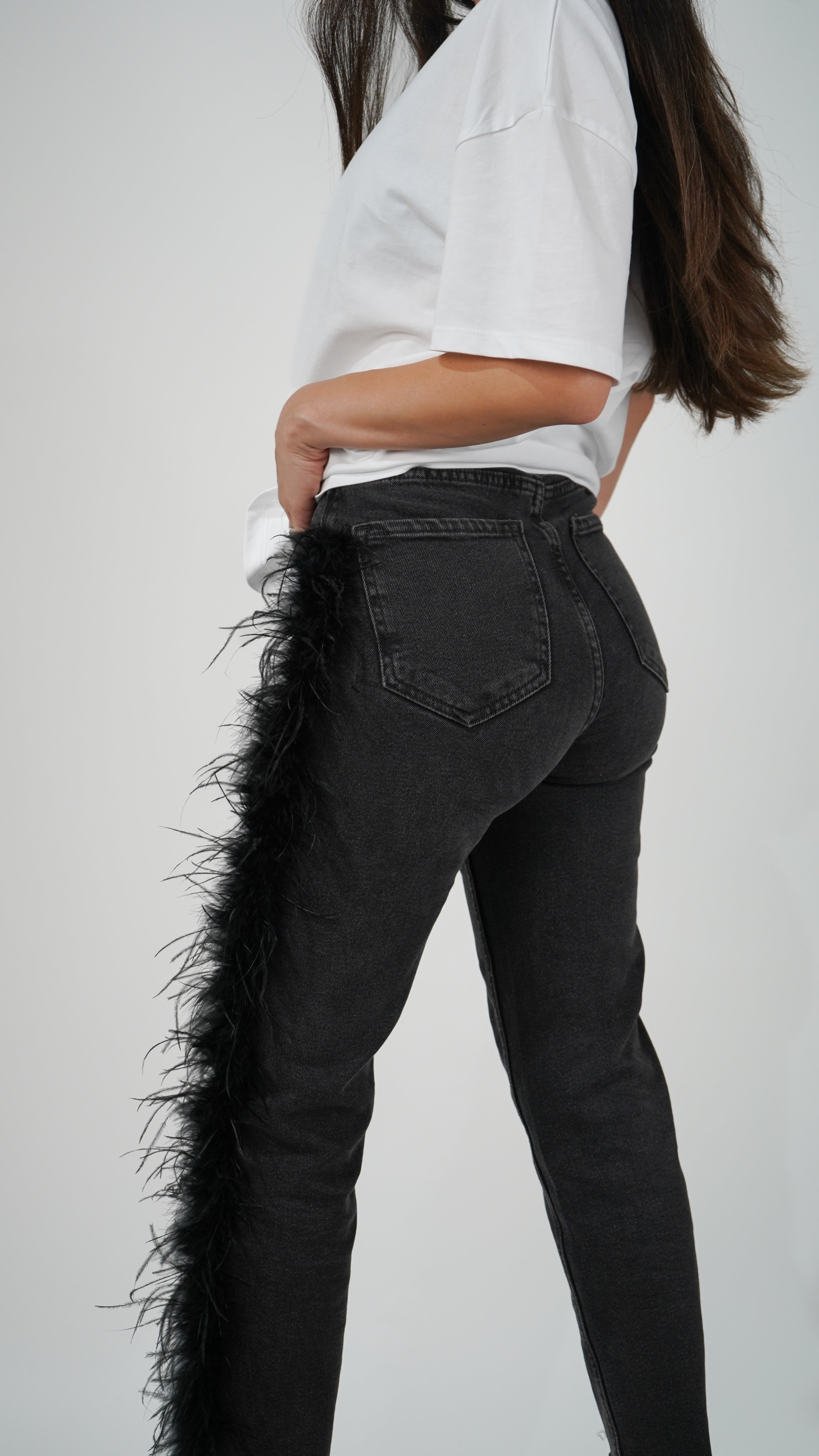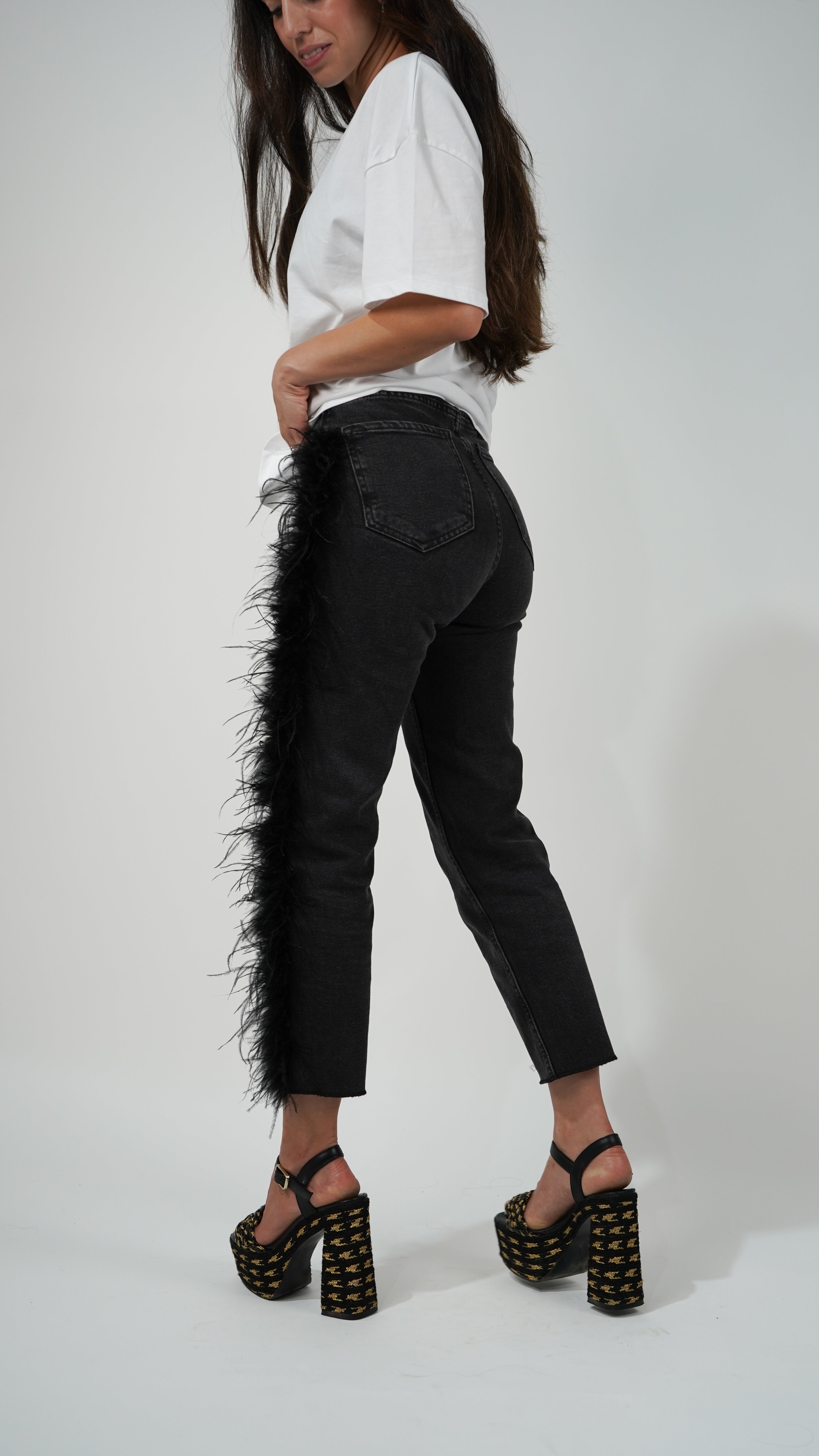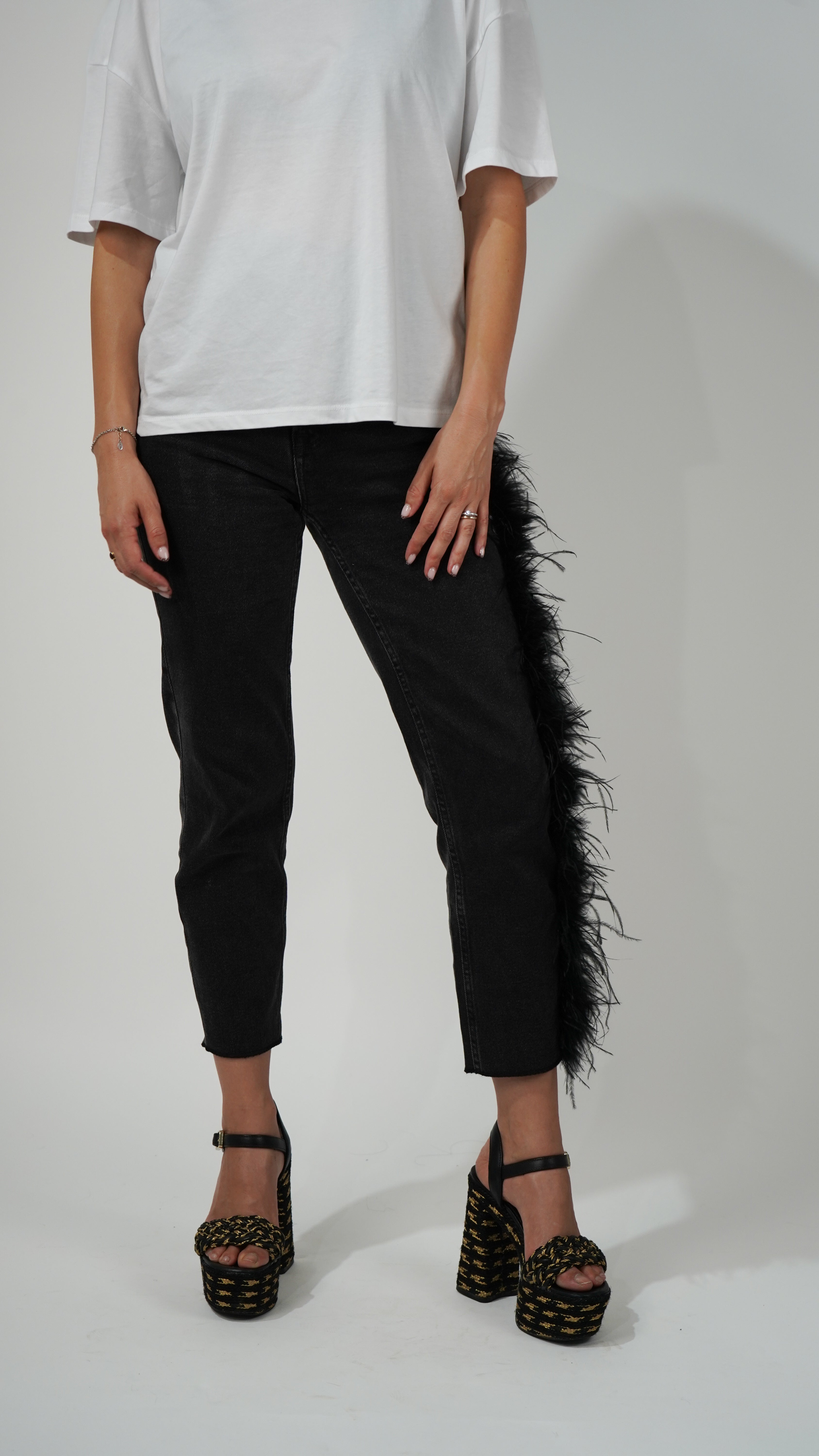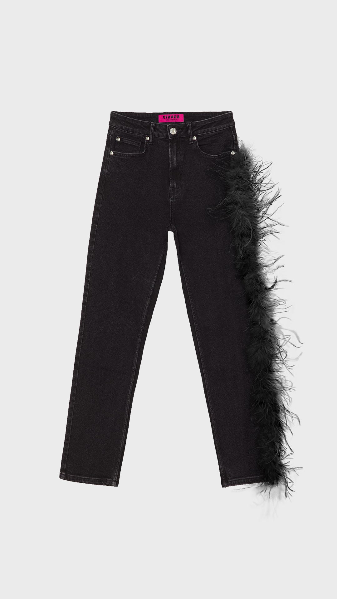 El pantalón presenta un detalle único: una boa de plumas que recorre el lateral izquierdo desde justo debajo del bolsillo delantero hasta el bajo.
