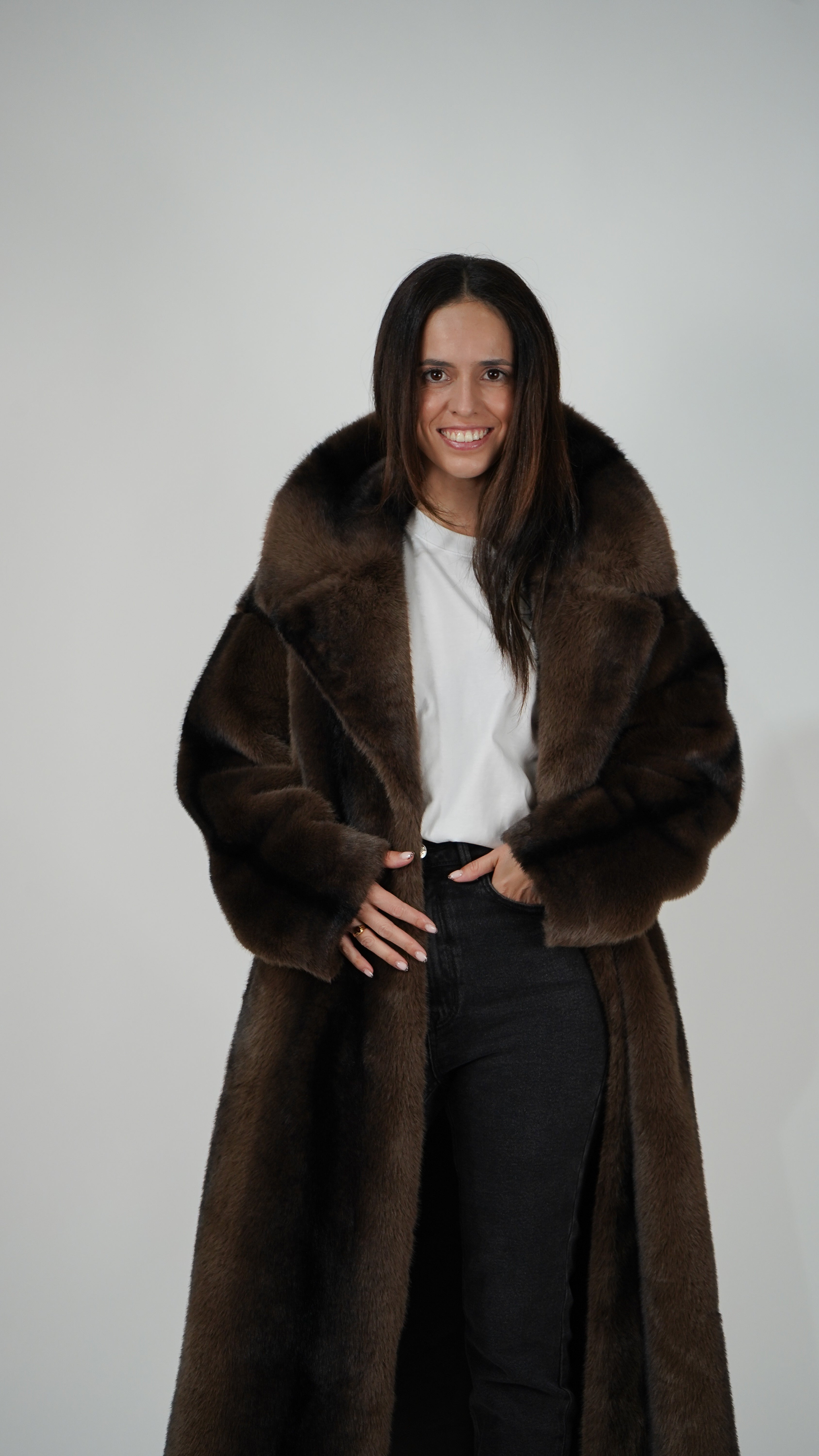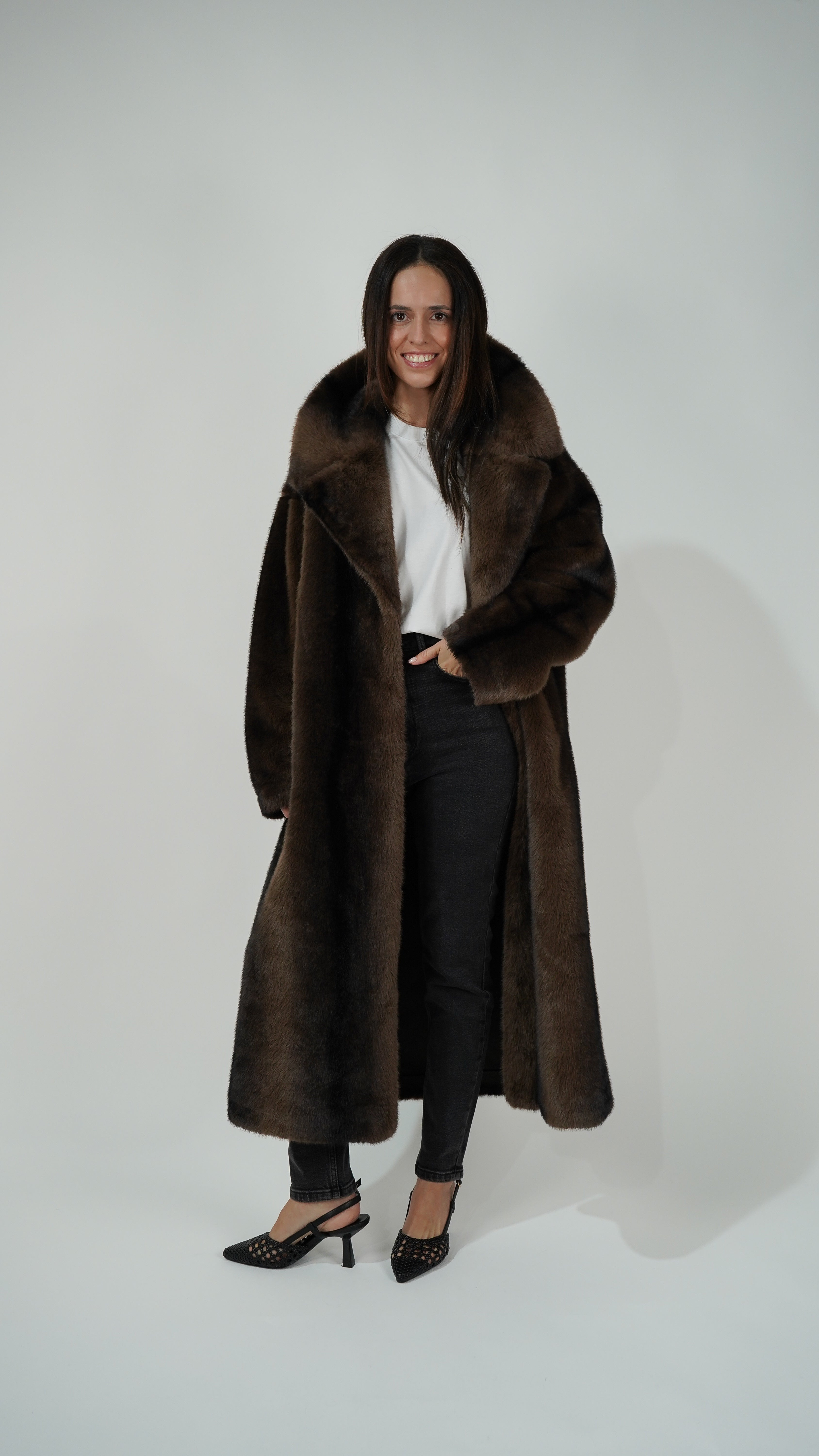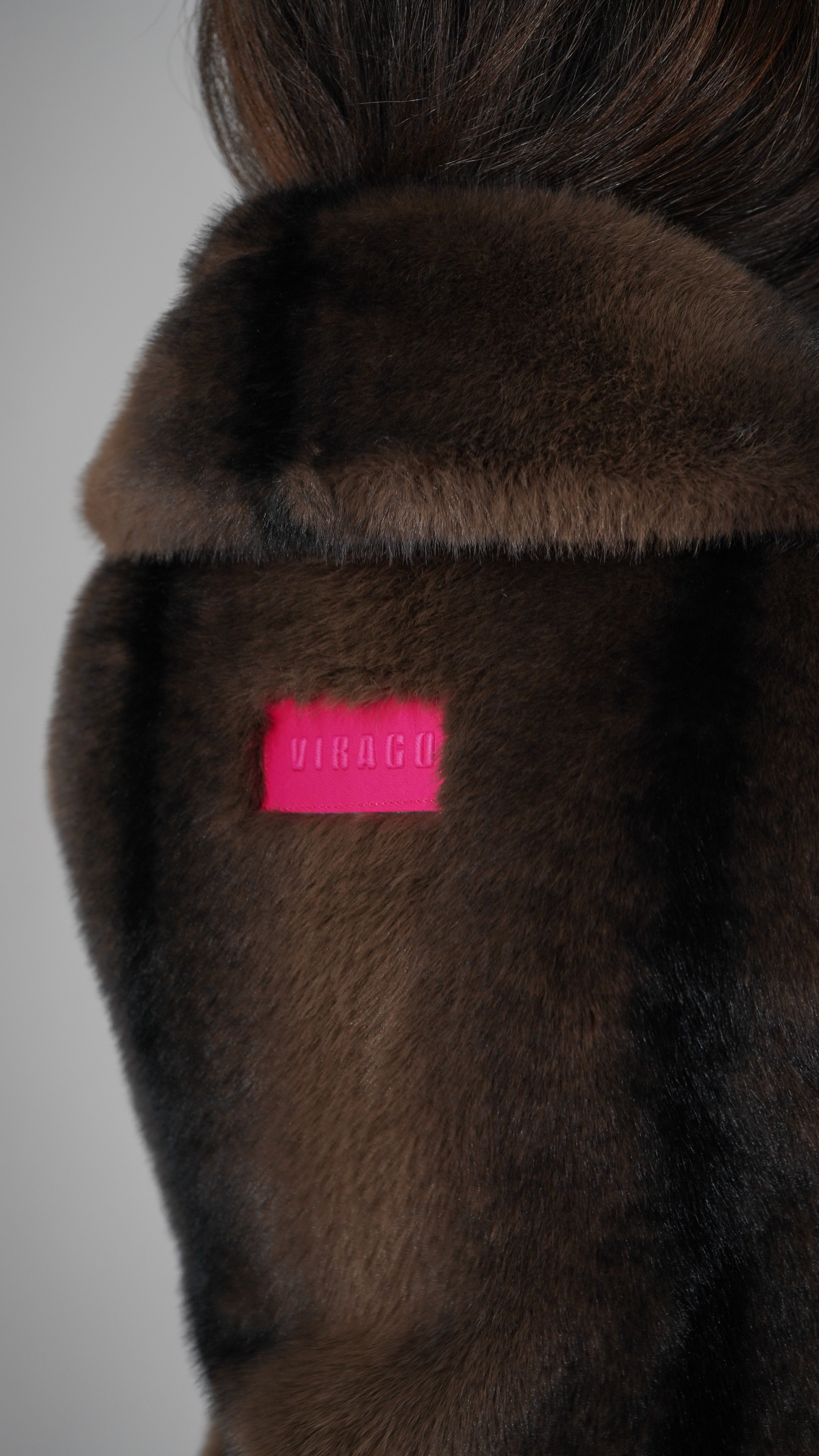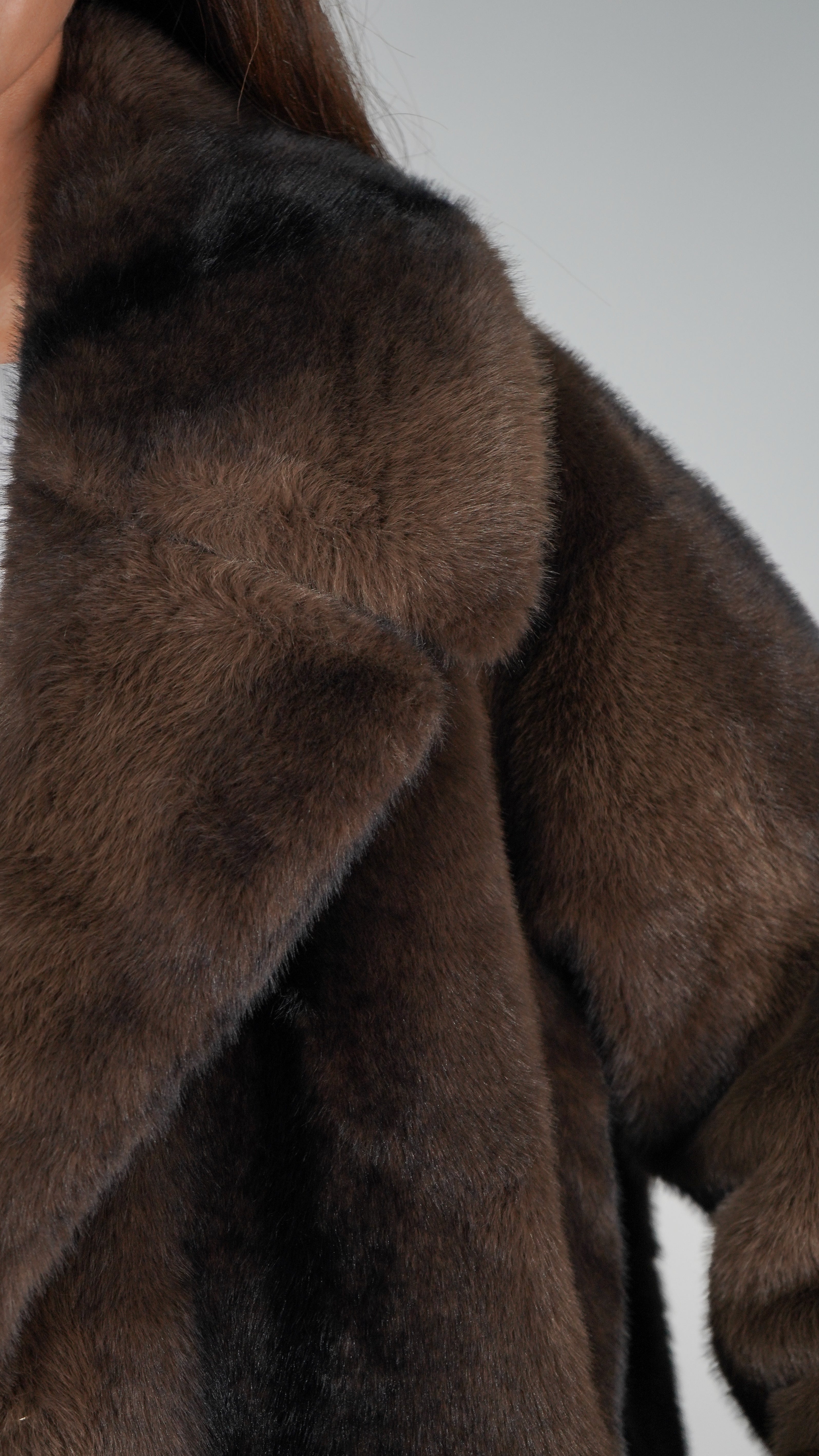 Pelo vegano en tonos chocolate y aguas negras para un efecto hiperrealista.