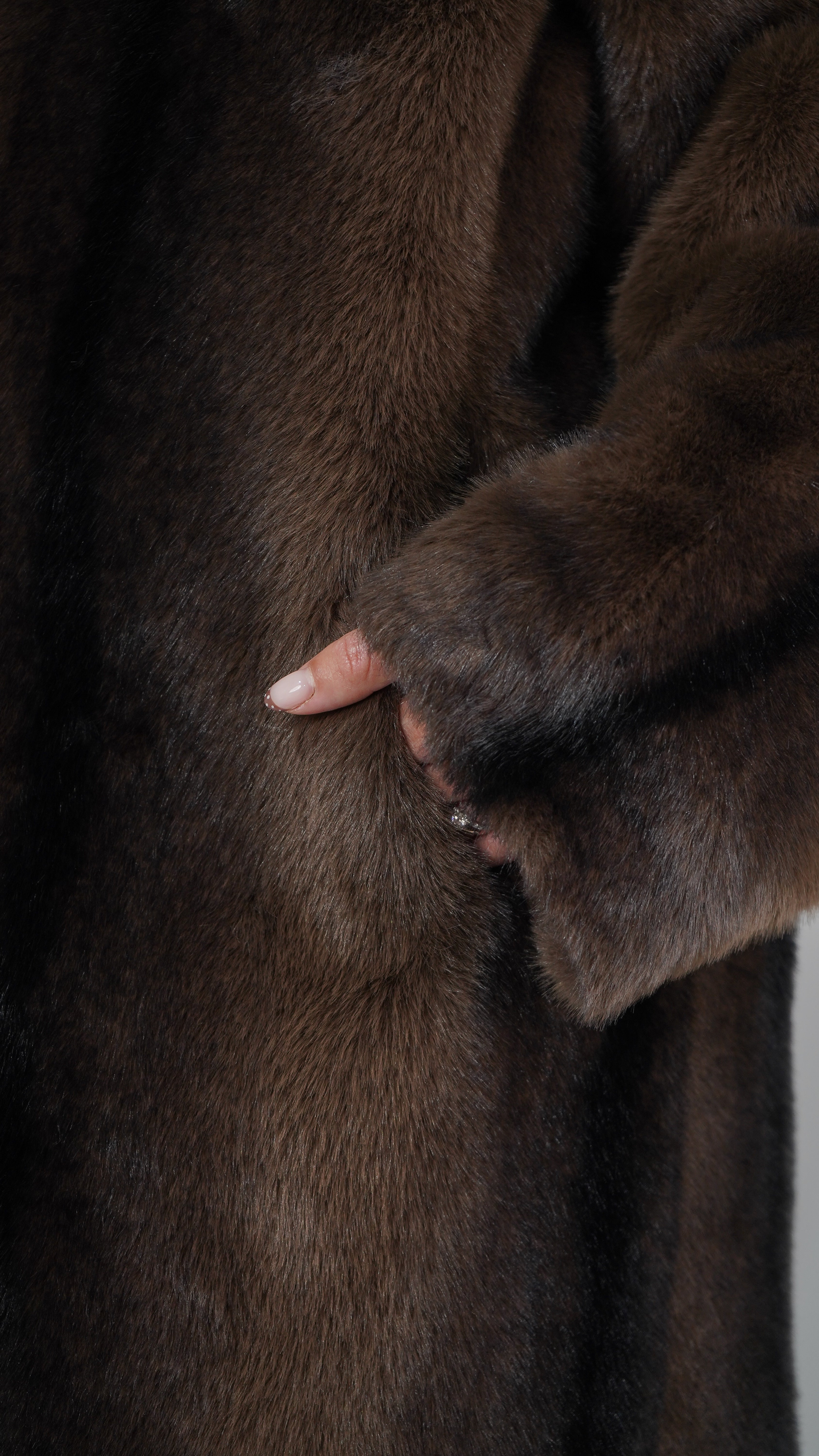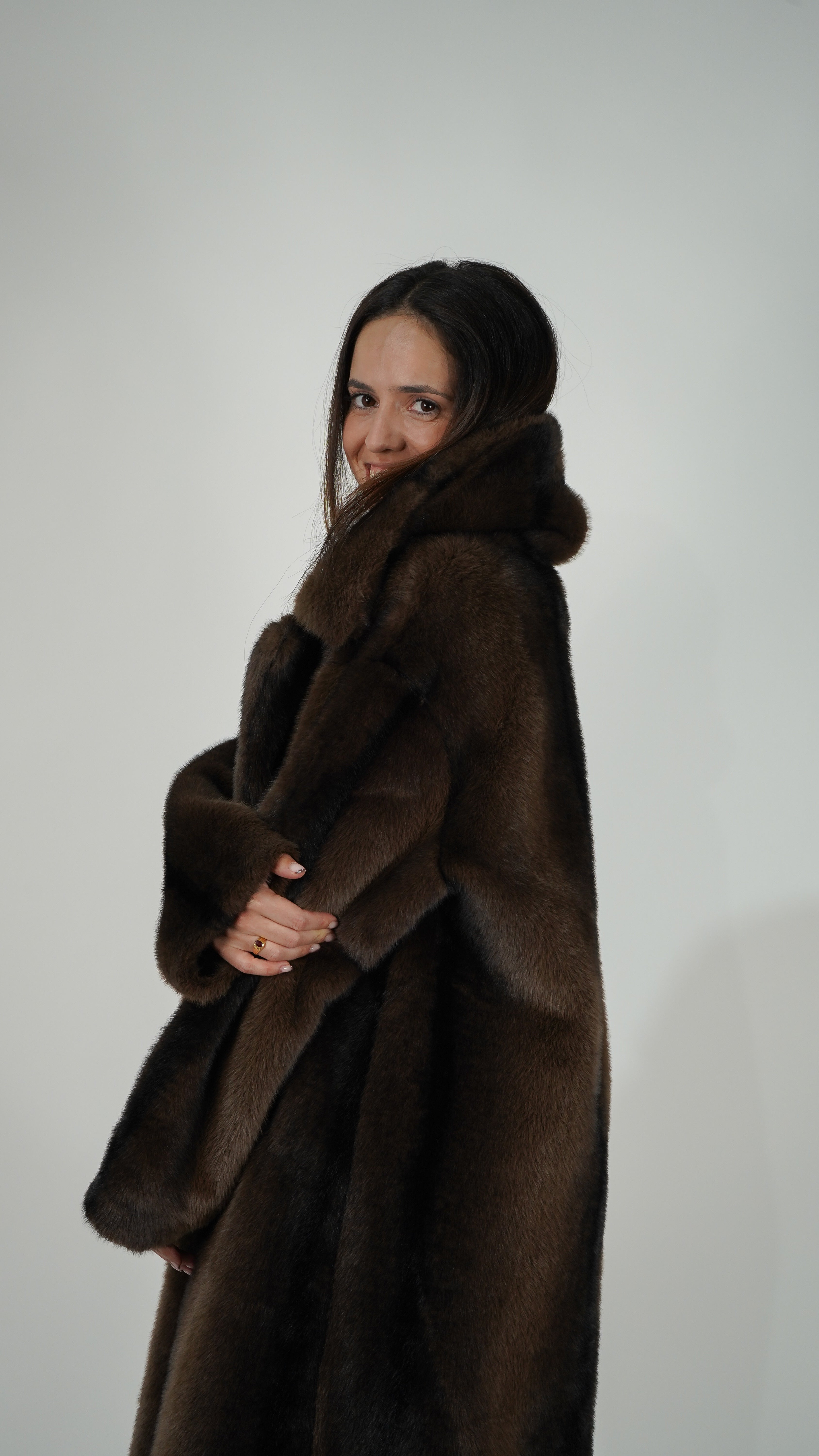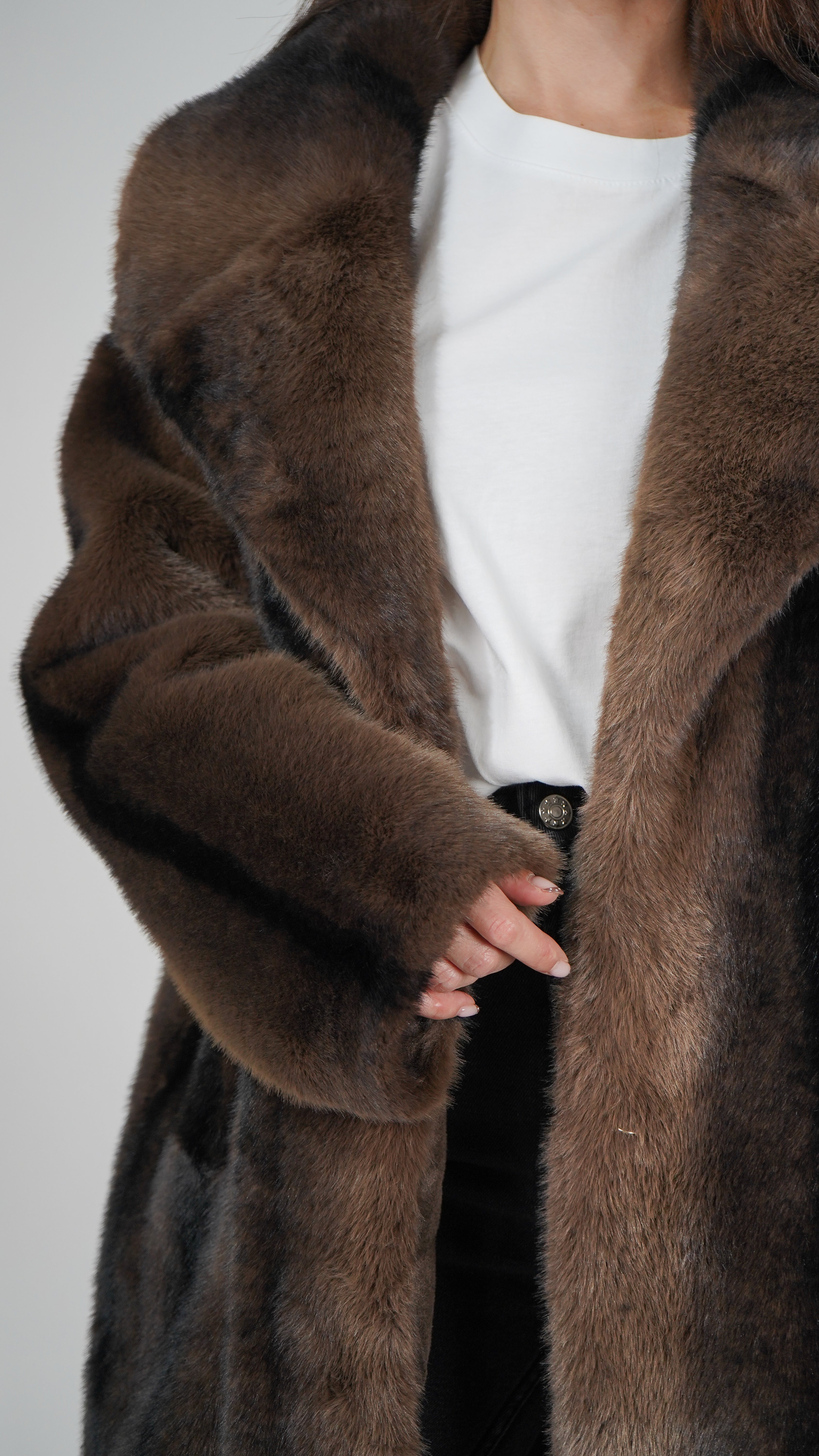 Pelo vegano en tonos chocolate y aguas negras para un efecto hiperrealista.