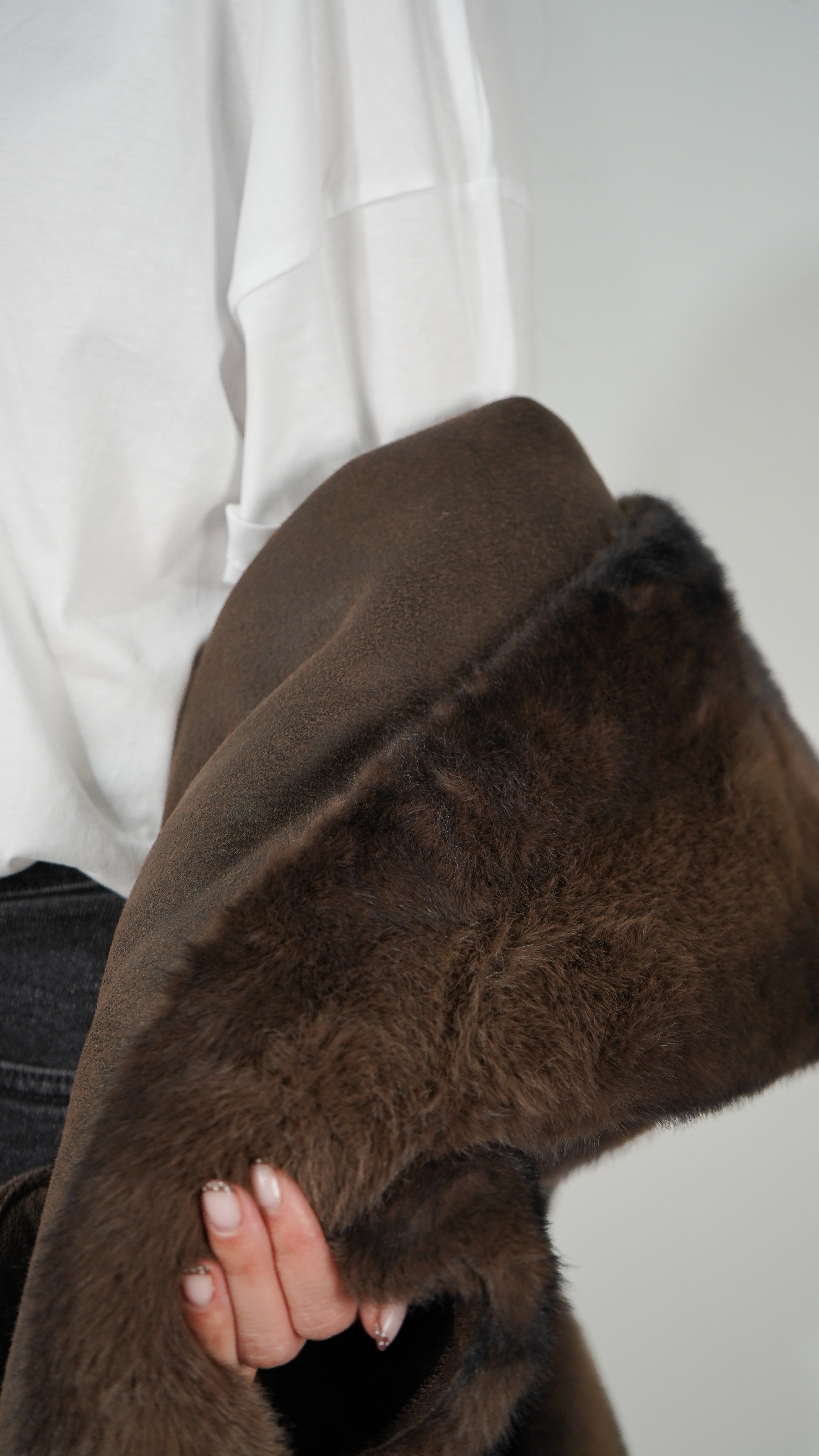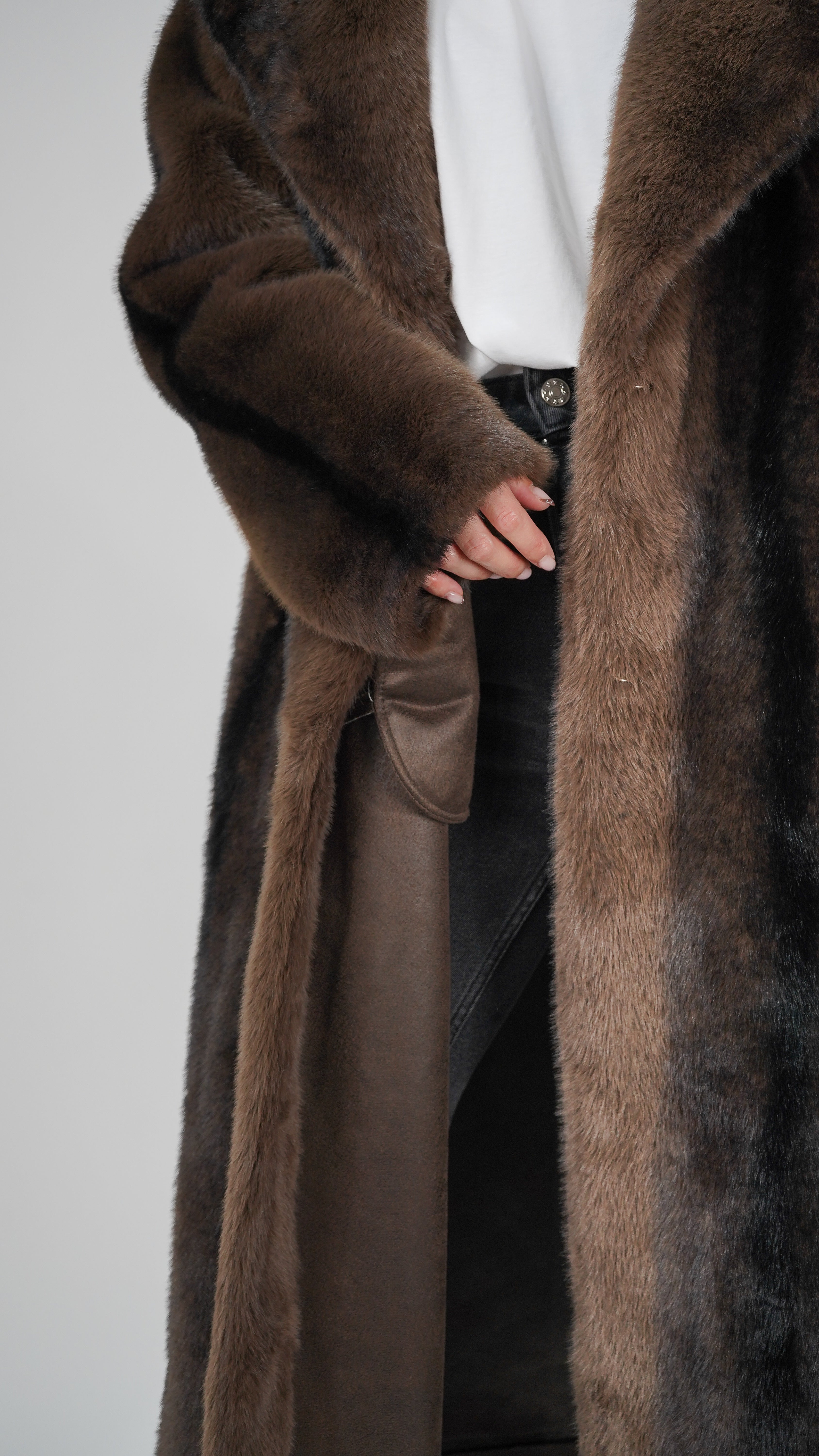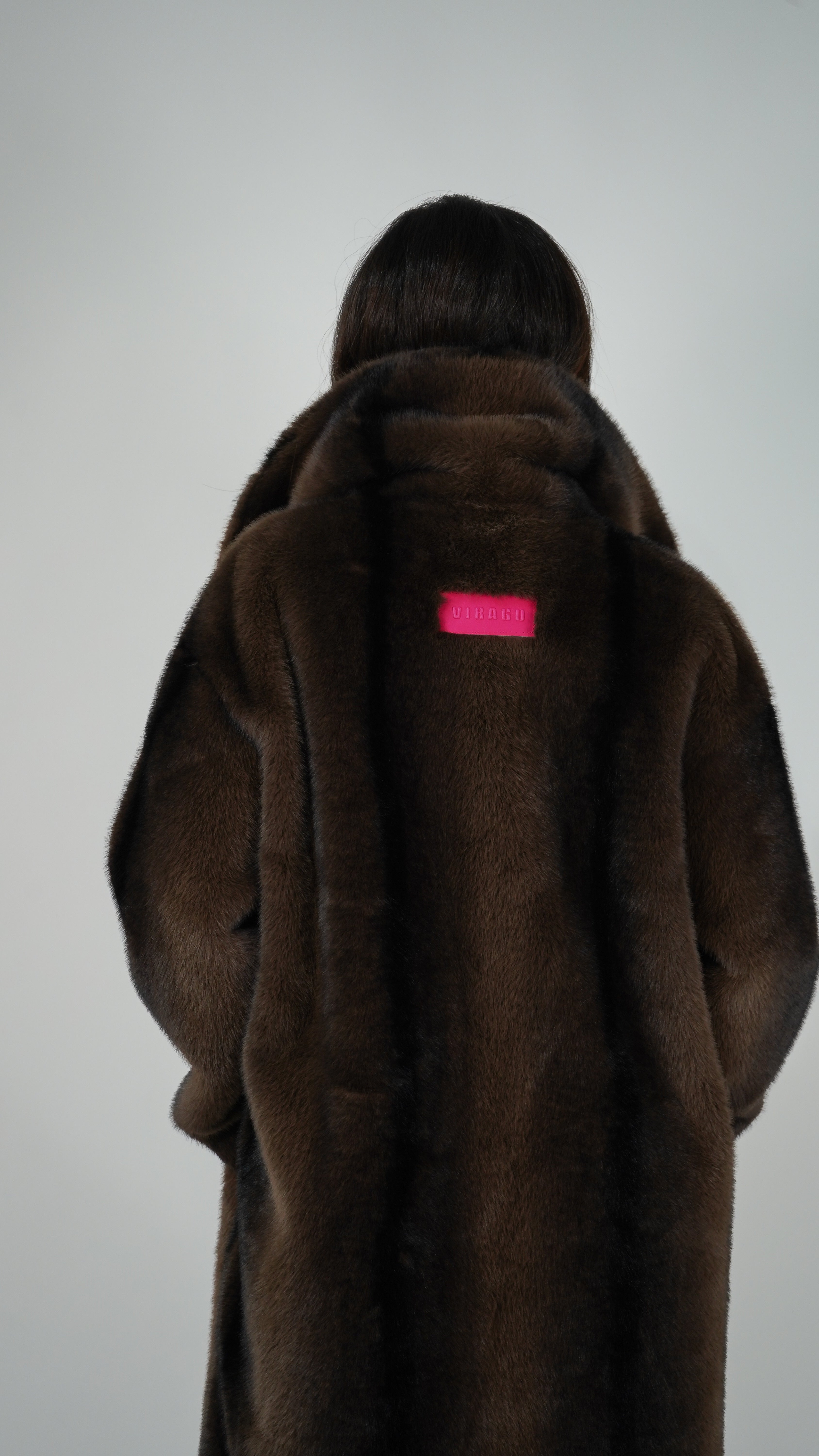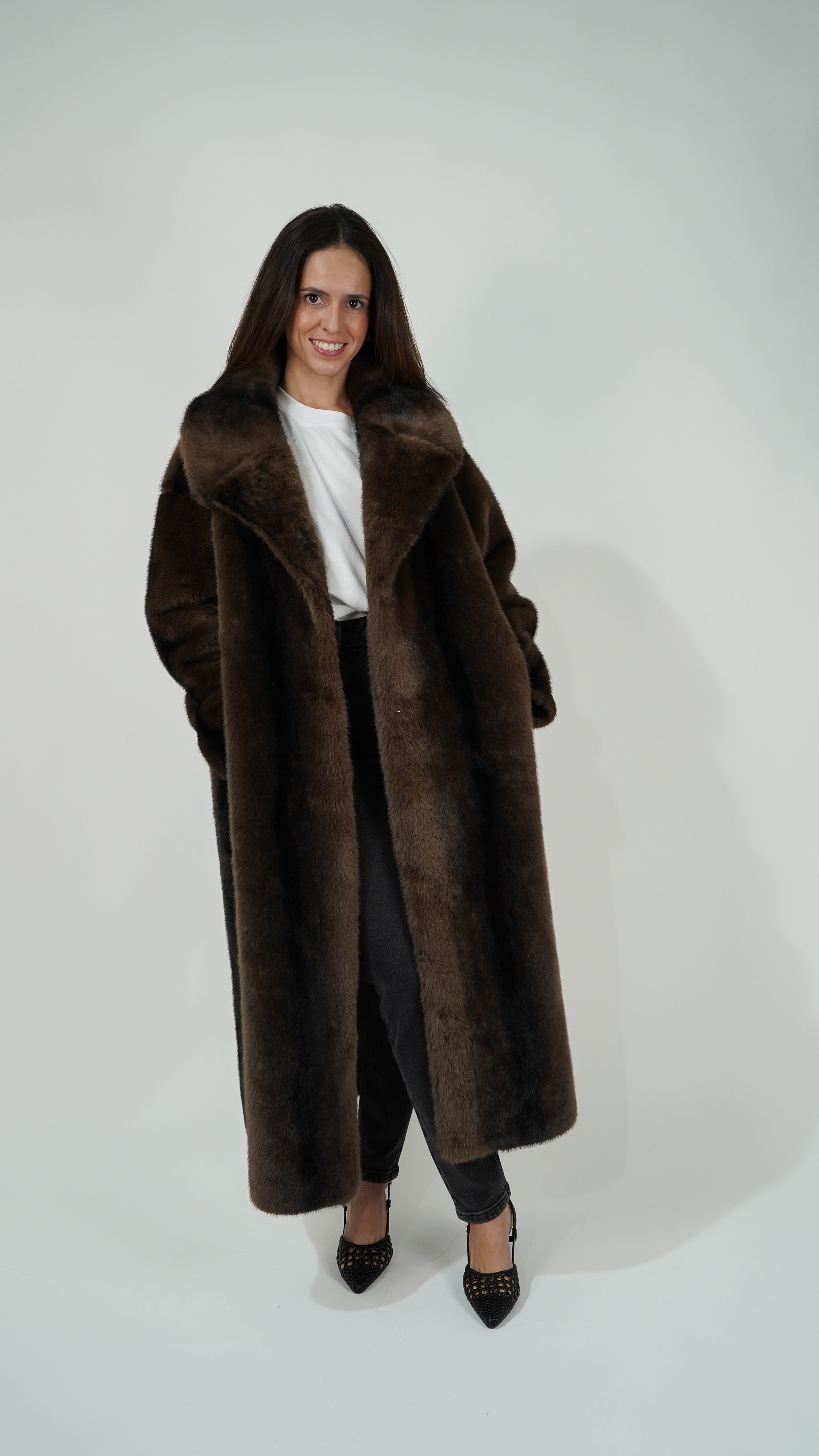 Pelo vegano en tonos chocolate y aguas negras para un efecto hiperrealista.